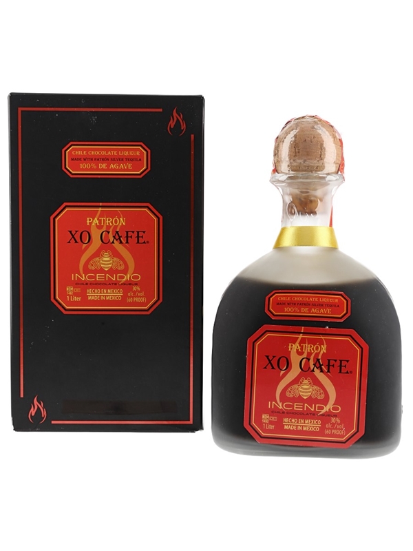A litre bottle of Patrón XO Café Incendio, a Chile Chocolate liqueur made with Patrón Silver Tequila from Mexico.