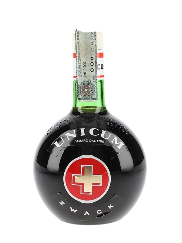 A bottle of Zwack Unicum, a bitter herbal liqueur from Hungary. This was imported to Italy by Spirit, we estimate the 1960s.