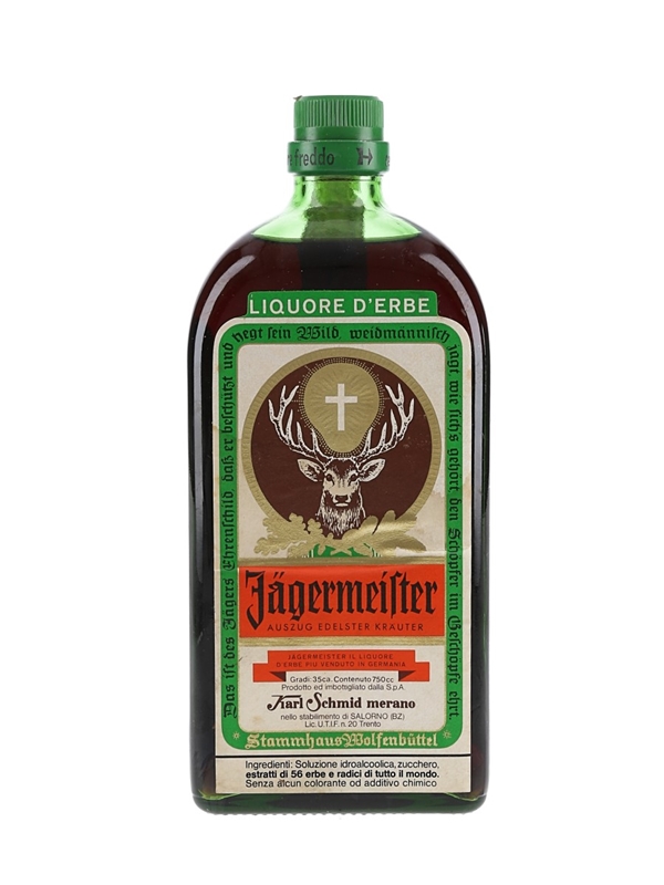 A bottle of Jägermeister herbal liqueur produced in Italy by Karl Schmid. We estimate this was bottled in the 1980s.