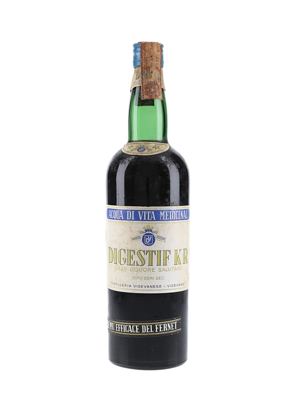 A litre bottle of Digestif KR Gran Liquore Salutare ipo Demi Sec Acqua Di Vita Medicinal from Italy. We estimate this was bottled in the 1950s.