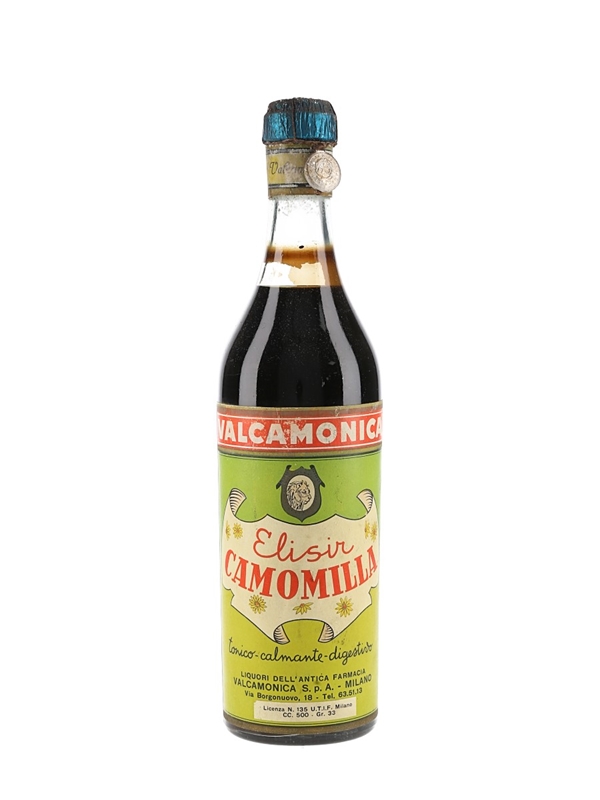 A 50cl bottle of Valcamonica Elisir Camomilla, an Italian liqueur flavoured with chamomile produced in Italy. We estimate this was bottled in the 1940s.