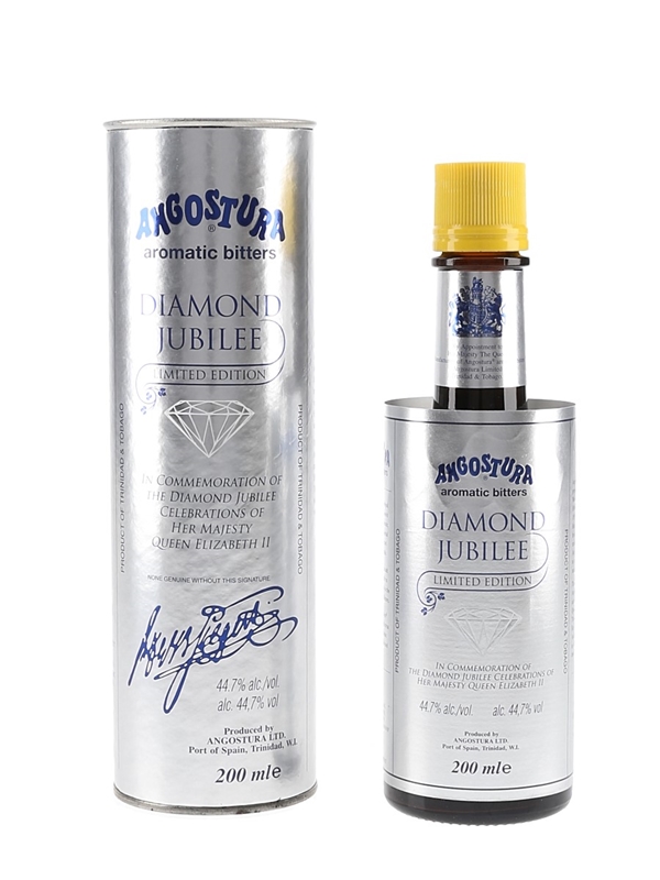 A 20cl bottle of Angostura Aromatic Bitters from Trinidad. This was produced to commemorate the Diamond Jubilee celebrations of Her Majesty The Queen Elizabeth II in 2012.