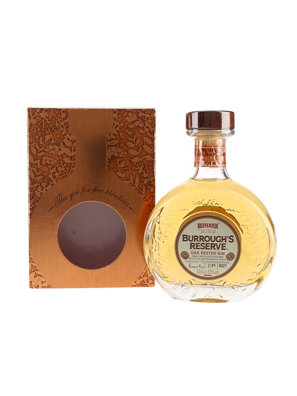 A bottle of Beefeater Burrough's Reserve Oak Rested Gin. This gin was distilled in a 19th century still and rested in red and white Bordeaux wine oak barrels.
