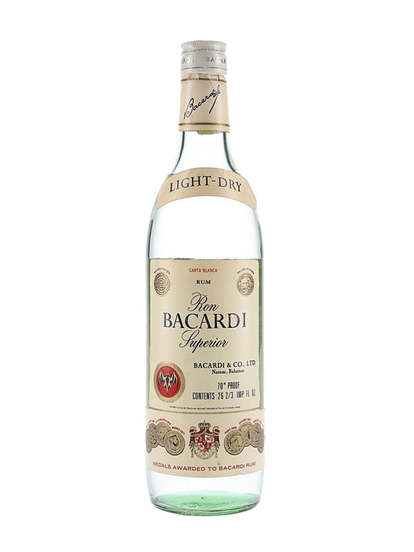 A bottle of Bacardi Carta Blanca rum from Nassau, Bahamas. We estimate this was bottled in the 1970s.