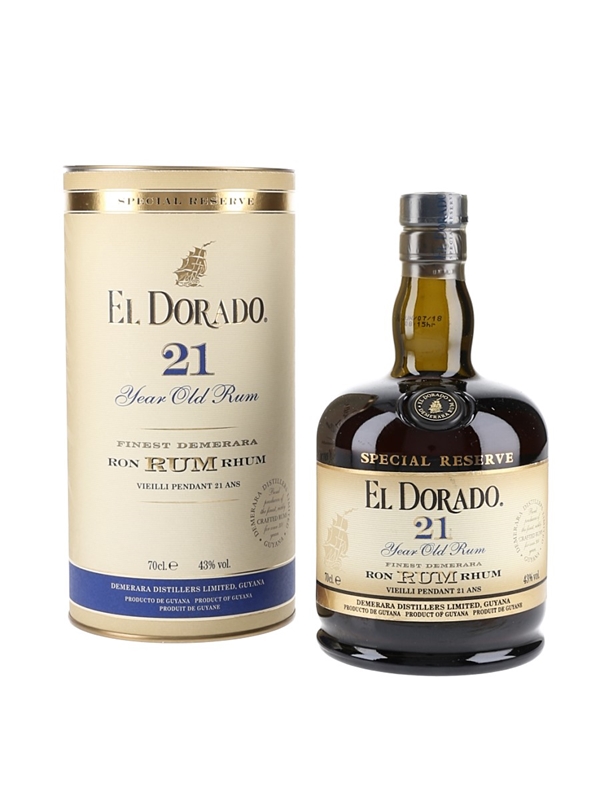 A bottle of El Dorado 21 Year Old Finest Demerara Special Reserve Rum.