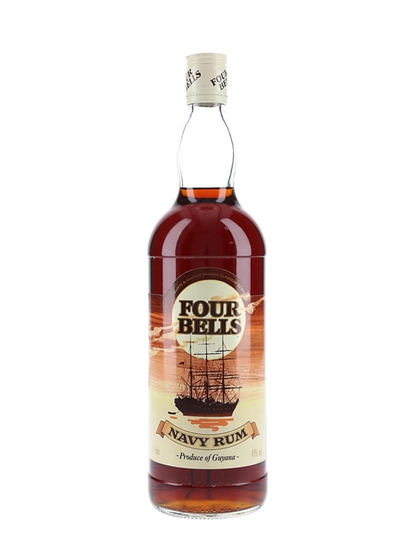 A litre bottle of Four Bells Navy Rum from Guyana, bottled by Whyte & Mackay Brands. We estimate this was bottled in the 1990s.