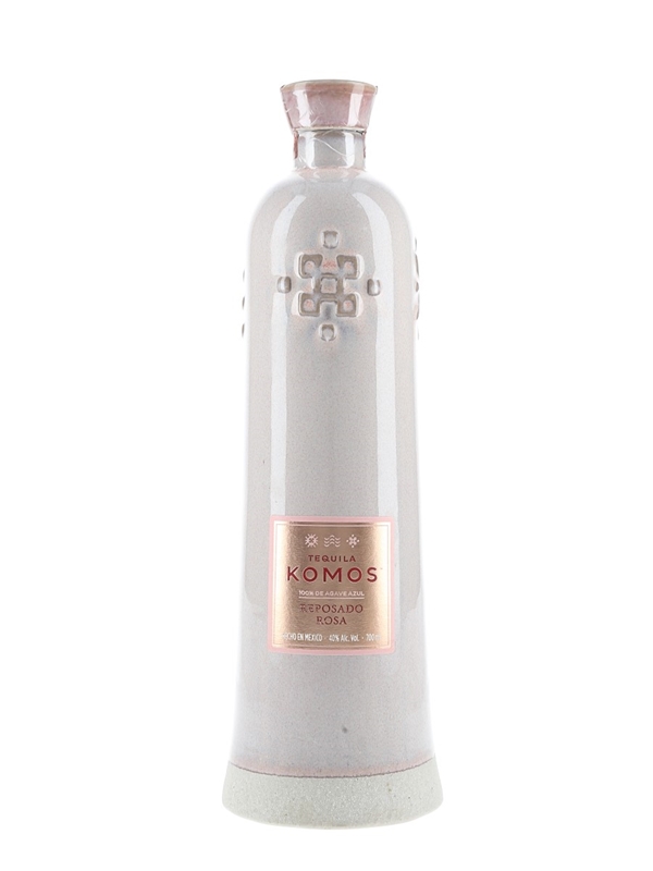 A bottle of Komos Reposado Rosa Tequila. This was matured in French oak red wine barrels for two months, before being bottled in a blue ceramic bottle. This was imported by Wine Logistics International Belgium.