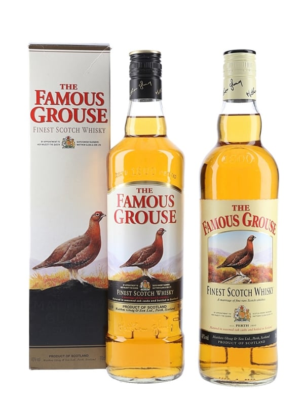 This lot contains two bottles of The Famous Grouse Blended Scotch Whisky, produced by Matthew Gloag & Son Ltd. The label carries a royal warrant by appointment to Her Majesty The Queen.