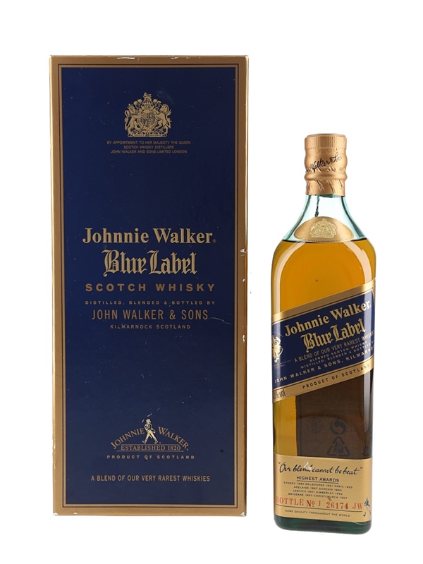 A bottle of Johnnie Walker Blue Label, a super premium blend made from long-aged malt and grain whiskies.