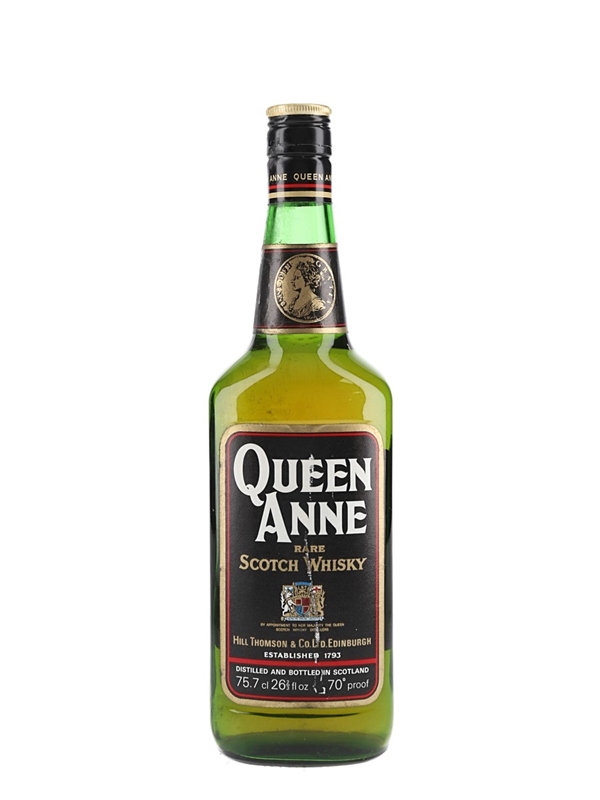 A bottle of Queen Anne Rare Scotch Whisky, blended and bottled by Hill Thomson & Co. (then a member of The Glenlivet Distillers Ltd). We estimate this was bottled in the 1970s.