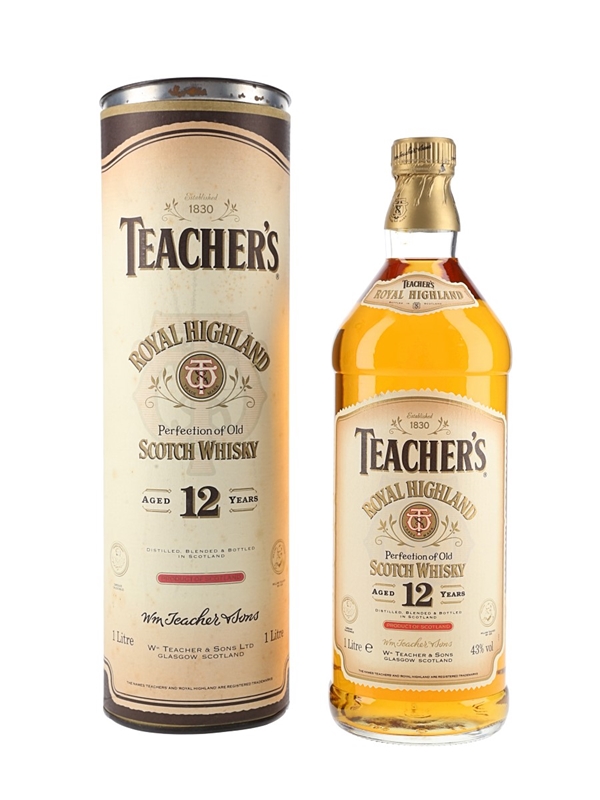 A litre bottle of Teacher's Royal Highland 12 Year Old Scotch whisky. We estimate this was bottled in the 1990s.