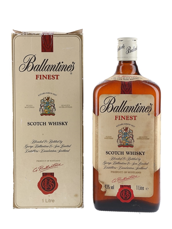 A litre bottle of Ballantine's Finest Scotch Whisky, produced by George Ballantine & Son Limited. We estimate this was bottled in the 1980s.