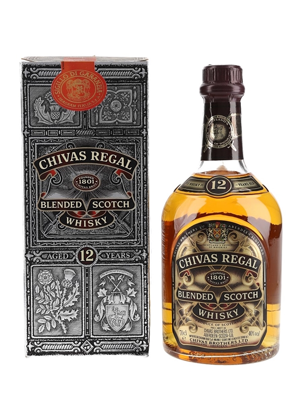 A bottle of Chivas Regal 12 Year Old Blended Scotch Whisky, blended by Chivas Brothers Ltd. We estimate this was bottled in the 1990s.