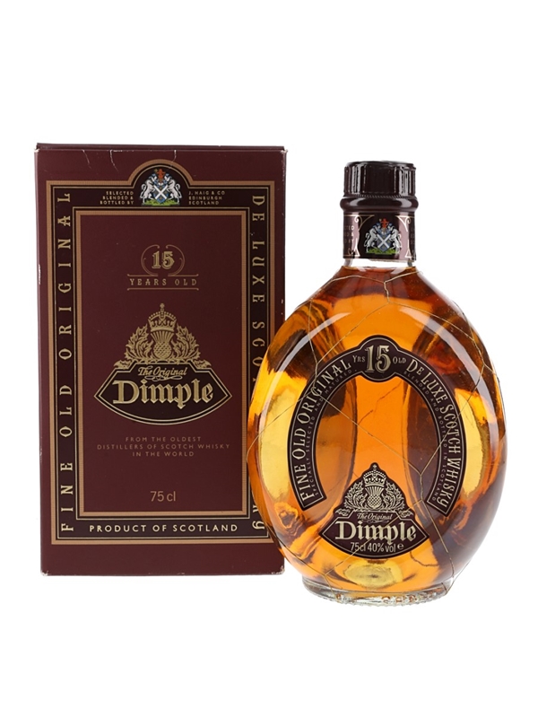 A bottle of Dimple 15 Year Old Fine Old Original De Luxe Scotch Whisky. We estimate this was bottled in the 1980s.