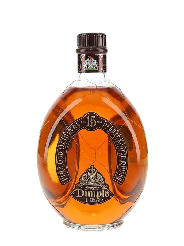 A litre bottle of Dimple 15 Year Old Fine Old Original De Luxe Scotch Whisky. We estimate this was bottled in the 1980s to 1990s.