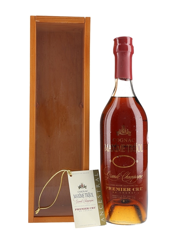 A bottle of Maxime Trijol Cognac. This was produced using grapes grown in Grande Champagne, the premier cru of Cognac. This lot comes with a wooden box with a plastic front.