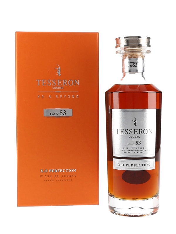 A bottle of Tesseron XO Perfection Cognac Lot No.53, produced exclusively from grapes grown in the Grande Champagne region of Cognac.