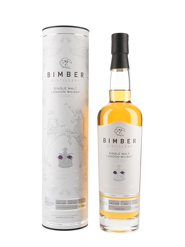 A bottle of Bimber The Queen's Platinum Jubilee Single Malt Scotch Whisky Small Batch. This was distilled in April 2018 matured in ex-bourbon oak casks and bottled in June 2022 at 51.8% ABV to celebrate the Queens Platinum Jubilee.