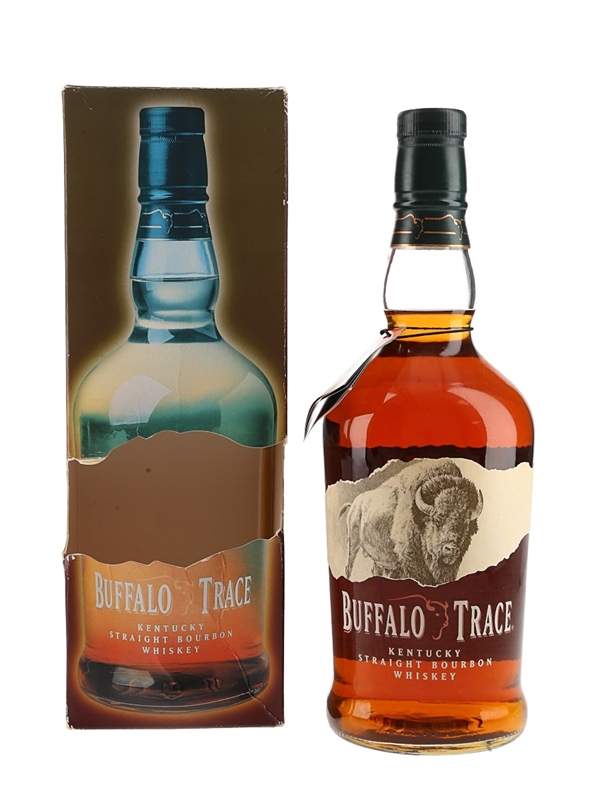 A bottle of Buffalo Trace Kentucky Straight Bourbon Whiskey, distilled, aged and bottled by Buffalo Trace Distillery, Franklin Co. Kentucky, USA.