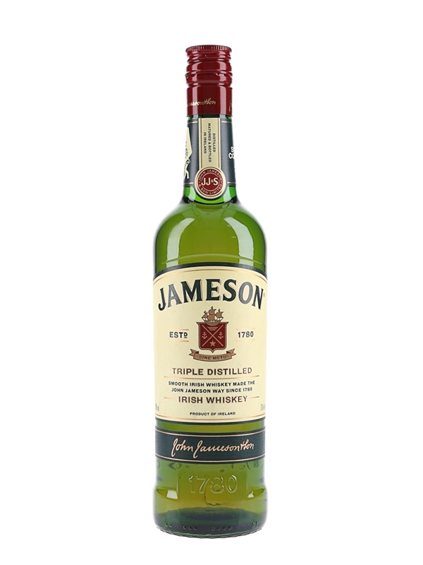 A bottle of Jameson Triple Distilled Irish Whiskey.