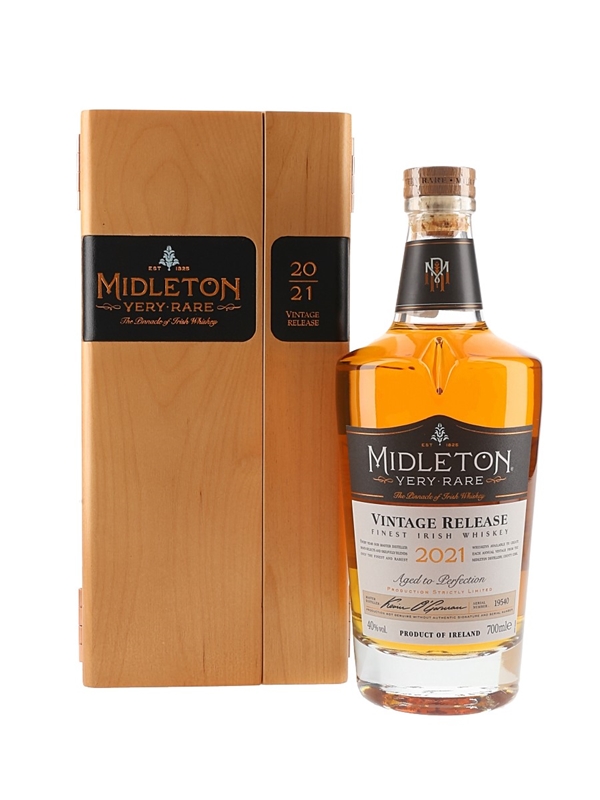 A bottle of Midleton Very Rare Irish Whiskey bottled in 2021. Every year since 1984, a new edition has been released in limited quantities. This comes in a wooden presentation box with a certificate of authenticity.This is bottle number 19540.