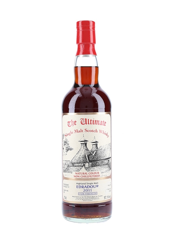 A bottle of Edradour 9 Year Old The Ultimate Single Malt Scotch Whisky. This was distilled on 04 February 2011, matured in a first fill sherry butt and bottled at cask strength on 17 April 2020 by The Ultimate Whisky Company.