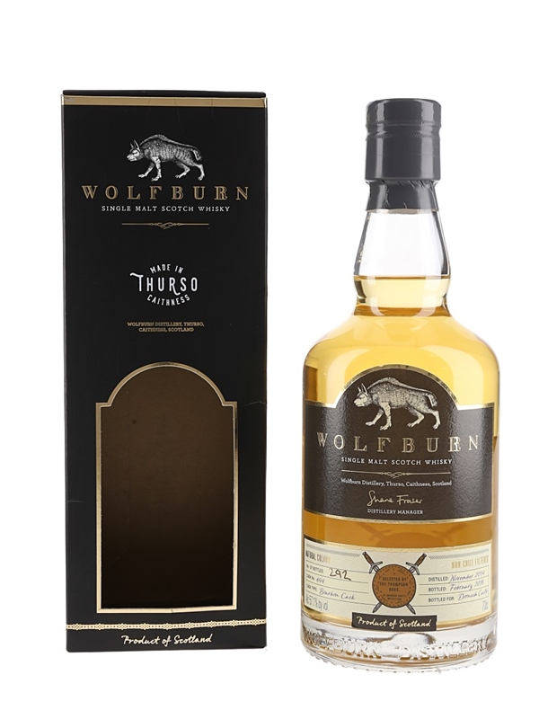 A bottle of Wolfburn Single Malt Scotch Whisky bottled to celebrate the 18th Anniversary of Dornoch Castle Whisky Bar. This was distilled on November 2014, matured in a bourbon cask and bottled at 57.1% ABV in February 2018.