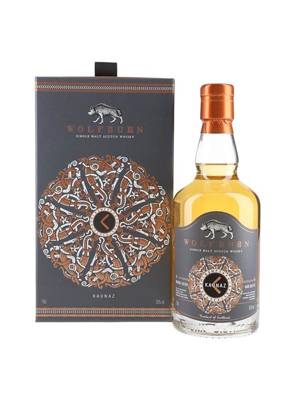 A bottle of Wolfburn's Kaunaz Single Malt Scotch Whisky. This is the sixth release in the Kylver Series, and was released in April 2020.