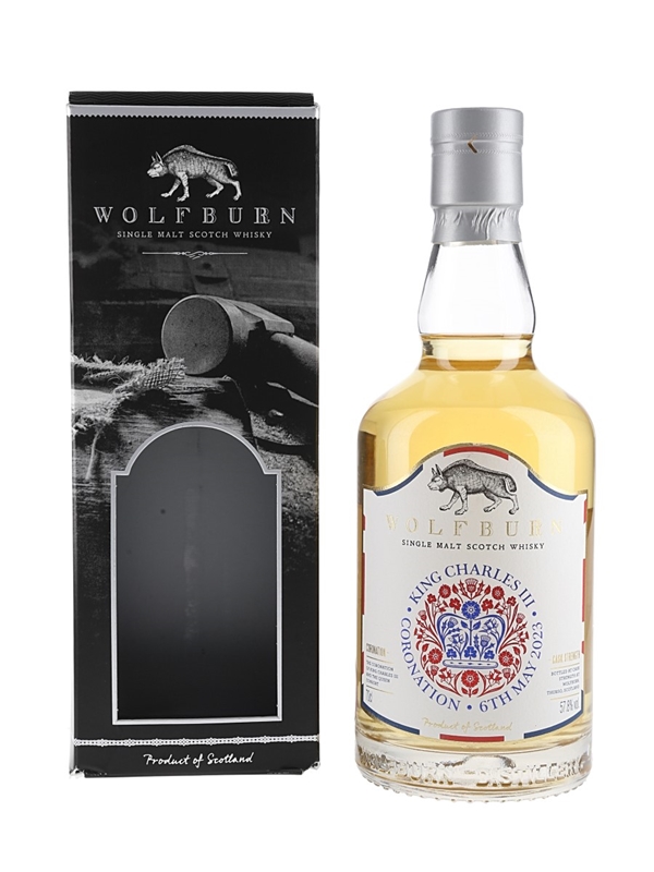 A limited release bottle of Wolfburn King Charles III Coronation Single Malt Scotch Whisky. This is one of 600 bottles, produced for King Charles III Coronation on the 6th of May 2023.