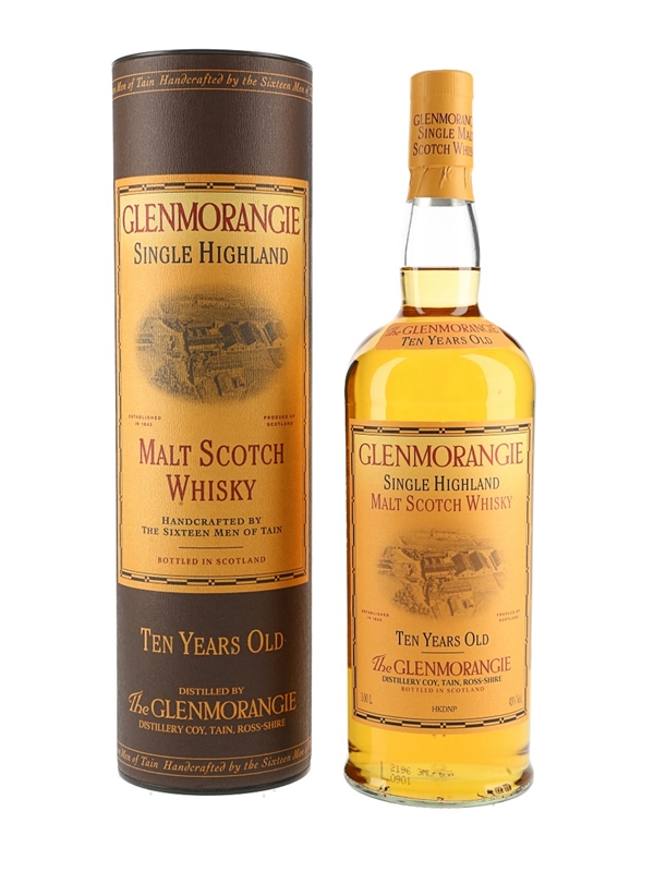 A litre bottle of The Glenmorangie 10 Year Old Highland Single Malt Scotch Whisky. The bottling code indicates this was bottled in 2002.