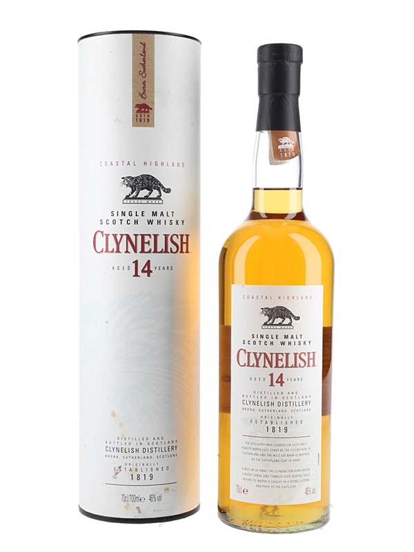 A bottle of Clynelish 14 Year Old Single Malt Coastal Highland Scotch Whisky, bottled at 46% ABV.