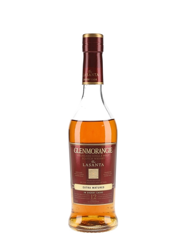 A bottle of Glenmorangie 12 year old Lasanta Single Malt Scotch Whisky matured in American white oak ex-bourbon casks before being extra-matured for a further in Oloroso and PX Sherry casks from Jerez in Spain. Lasanta is Gaelic for warmth and passion.