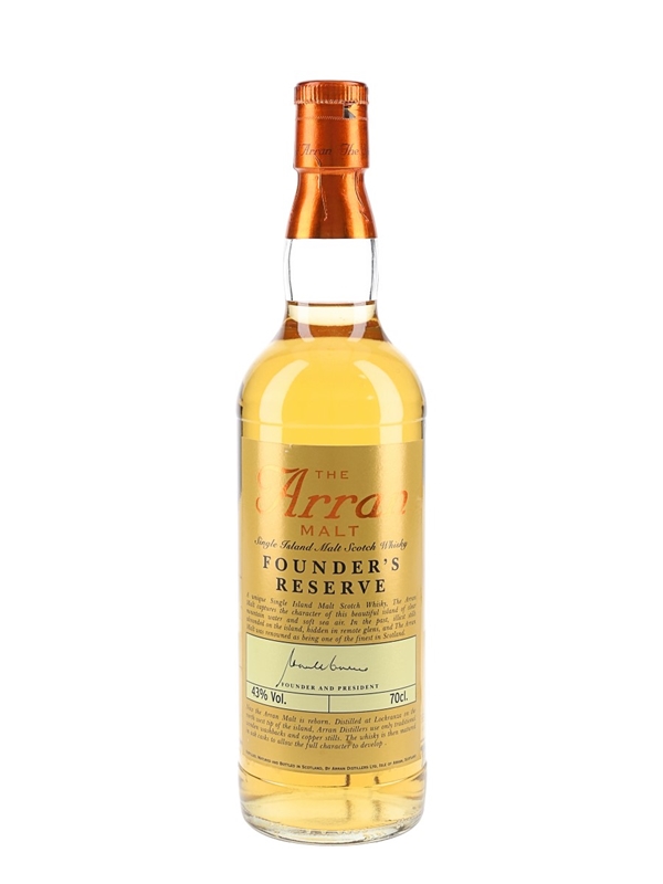 A bottle of The Arran Malt Founder's Reserve Single Island Malt Scotch Whisky, bottled exclusively for shareholders of the Arran distillery.
