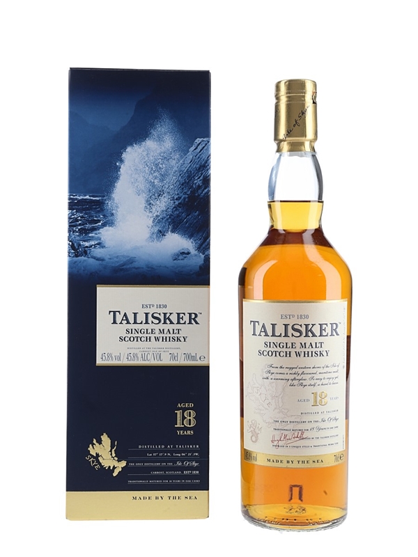 A bottle of Talisker 18 Year Old Single Malt Scotch Whisky from the Isle of Skye.