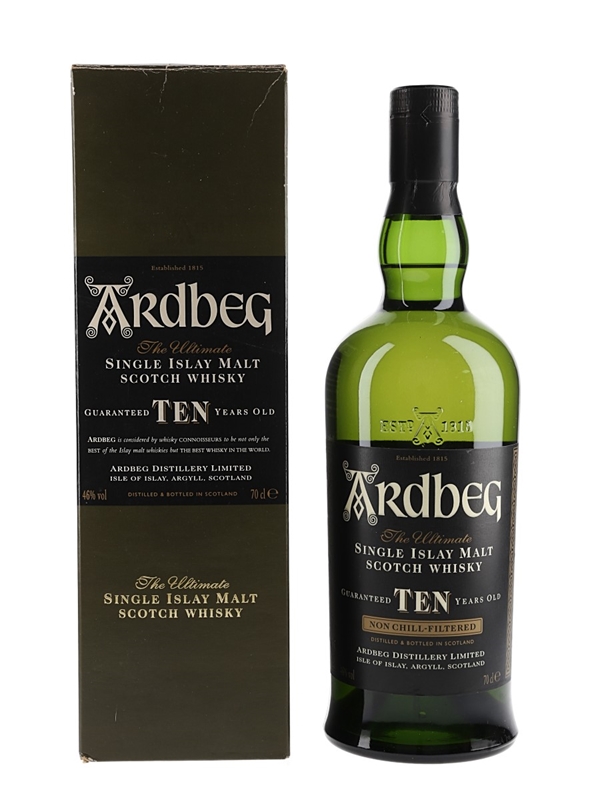 A bottle of Ardbeg 10 Year Old Single Islay Malt Scotch Whisky. The bottling code indicates this was bottled in 2004.