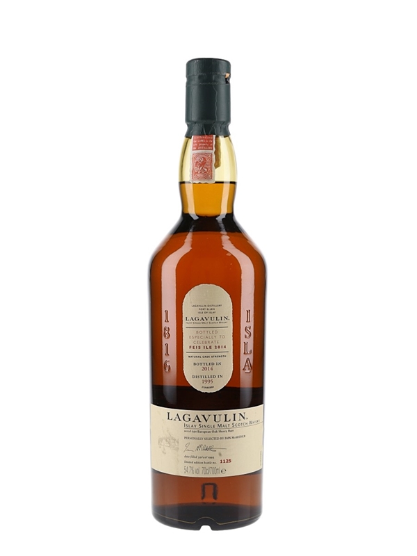 A bottle of Lagavulin Islay Single Malt Scotch Whisky. This was distilled on 30 January 1995, matured in an European oak sherry butt, selected by Iain McArthur and bottled at 54.7% ABV especially for Feis Ile 2014, the Islay festival of music and malt.