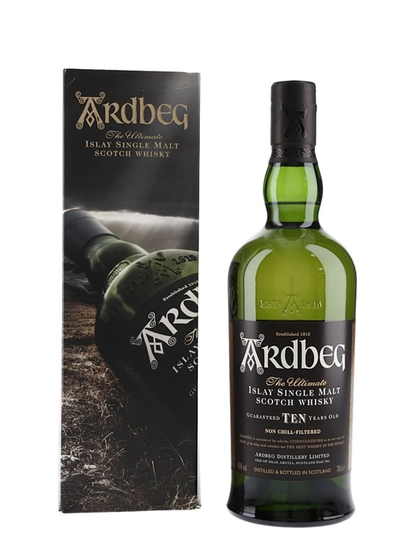 A bottle of Ardbeg 10 Year Old The Ultimate Islay Single Malt Scotch Whisky. The bottling code indicates this was bottled in 2014.
