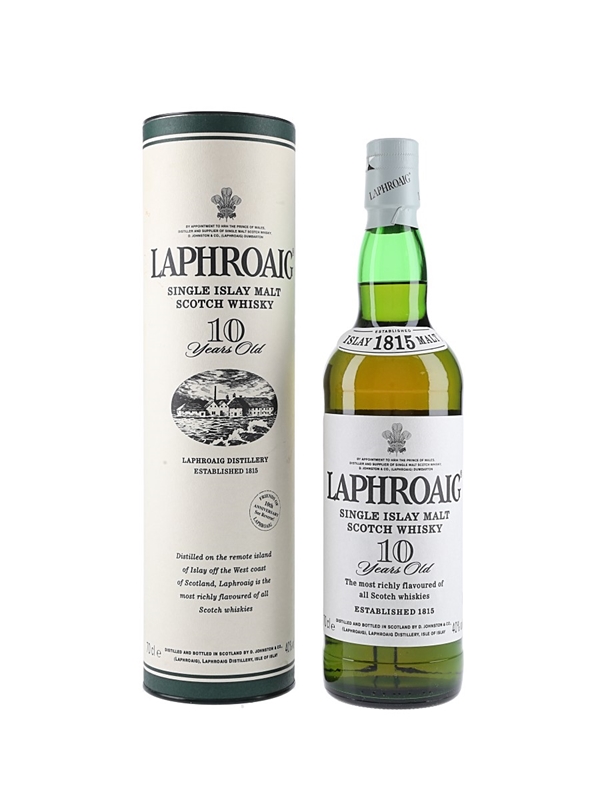 A bottle of Laphroaig 10 Year Old Single Islay Malt Scotch Whisky.