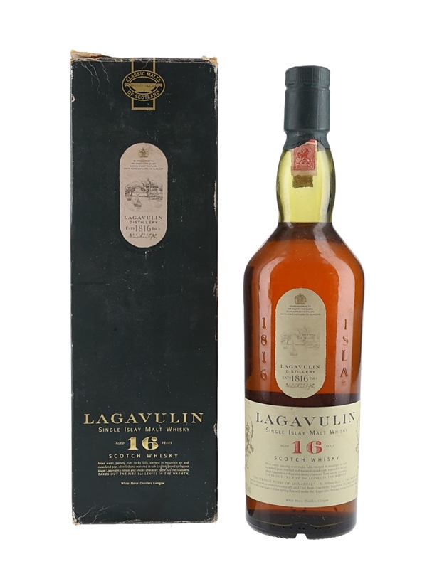 A bottle of Lagavulin 16 Year Old Single Islay Malt Scotch Whisky, part of Diageo's Classic Malts of Scotland range. We estimate this was bottled in the 1990s, when the distillery was still owned by White Horse Distillers.