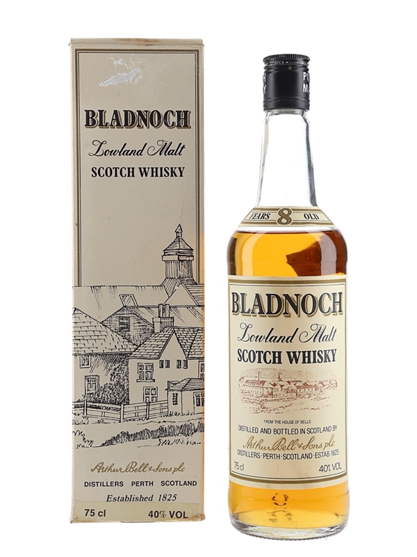 A bottle of Bladnoch 8 Year Old Lowland Malt Scotch Whisky From The House Of Bell's, distilled and bottled by Arthur Bell & Sons. We estimate was bottled in the 1980s.