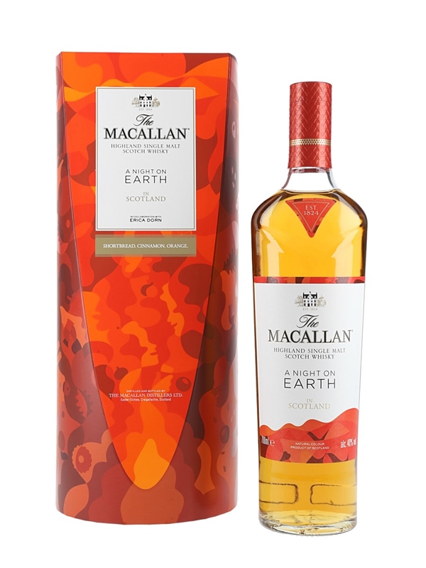 A limited edition bottle of The Macallan A Night On Earth in Scotland Highland Single Malt Scotch Whisky, celebrating the joy of New Year's Eve, known in Scotland as Hogmanay. This was aged in European and American sherry seasoned oak casks and ex-bourbon American oak casks. The packaging was designed by Japanese-French illustrator Erica Dorn.