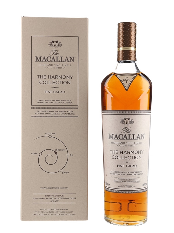 A bottle of The Macallan Fine Cacao Highland Single Malt Scotch Whisky from The Harmony Collection. This is inspired by the chocolate creations of Spanish chef Jordi Roca, pastry chef at El Celler de Can Roca. The restaurant was twice voted best restaurant in the world. This was sold at Hong Kong duty free stores.