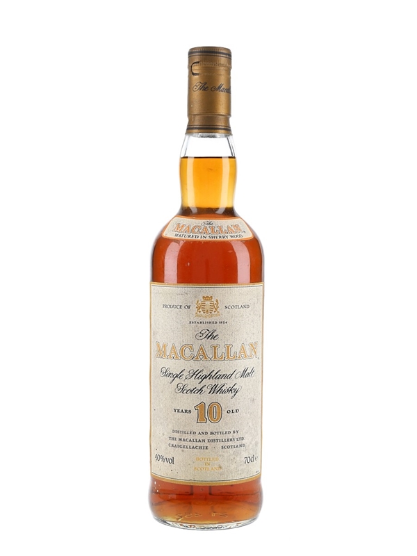 A bottle of The Macallan 10 Year Old Single Highland Malt Scotch Whisky, matured in sherry casks. We estimate this was bottled in the 1990s.