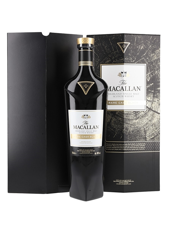 A bottle of The Macallan Rare Cask Black Highland Single Malt Scotch Whisky, made from peated malt matured in first fill sherry casks. This was hand selected by The Macallan's whisky maker Bob Dalgarno from fewer than 100 casks and bottled at 48% ABV.