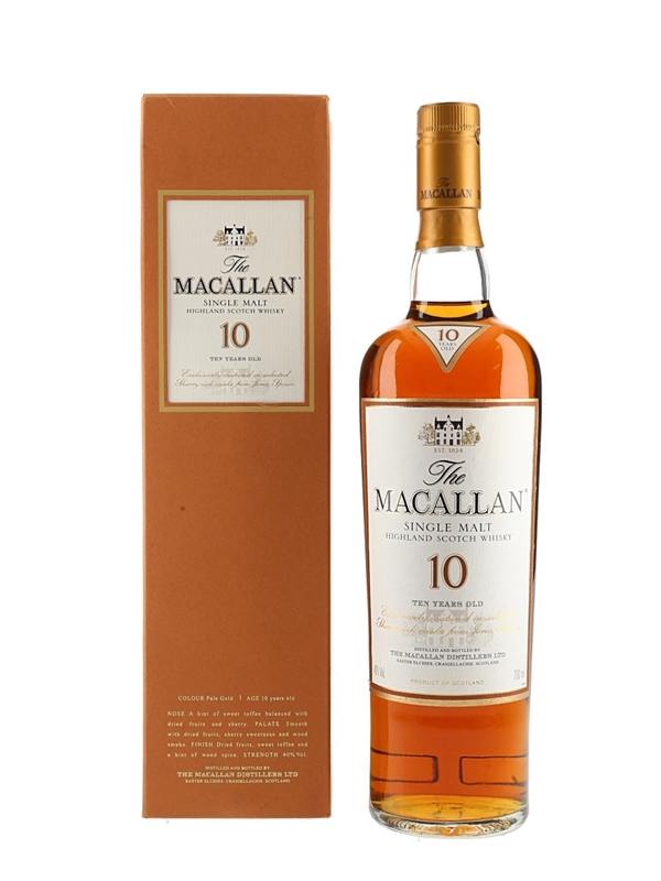 A bottle of The Macallan 10 Year Old Highland Single Malt Scotch Whisky, exclusively matured in selected sherry casks from Jerez, Spain. We estimate this was bottled in the early 2000s.