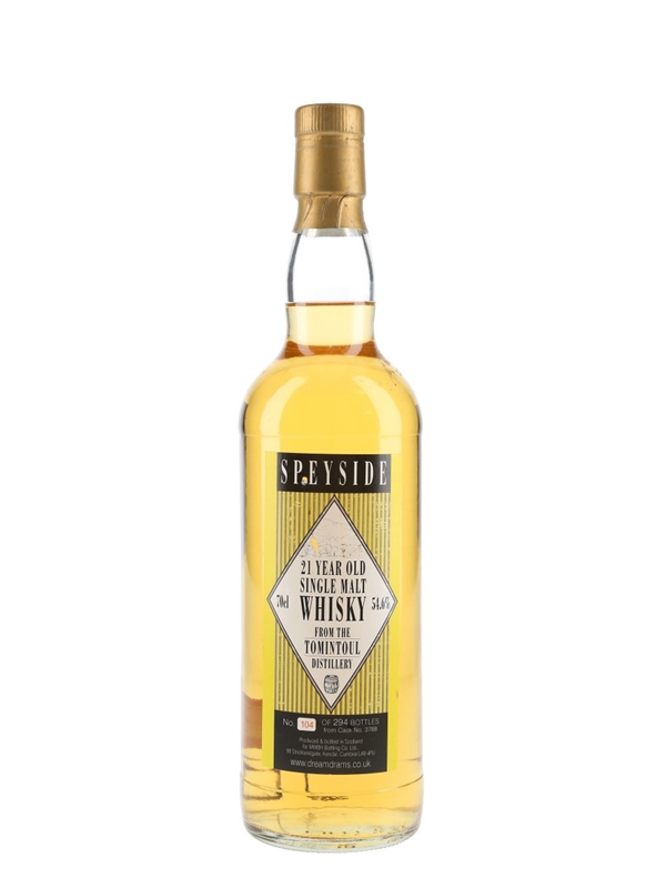 A bottle of Tomintoul 21 Year Old Speyside Malt Whisky. This was bottled at 54.6% ABV for dreamdrams.co.uk by MWBH Bottling Co. Ltd.