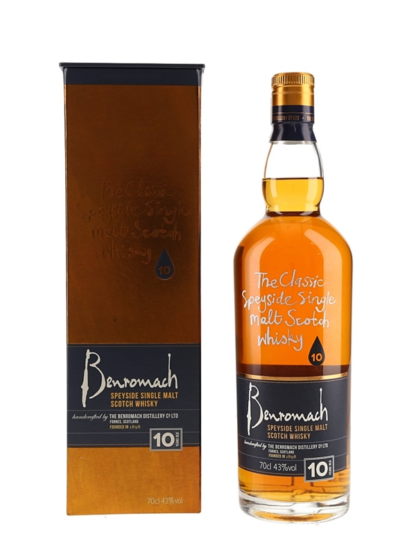 A bottle of Benromach 10 Year Old The Classic Speyside Single Malt Scotch Whisky.