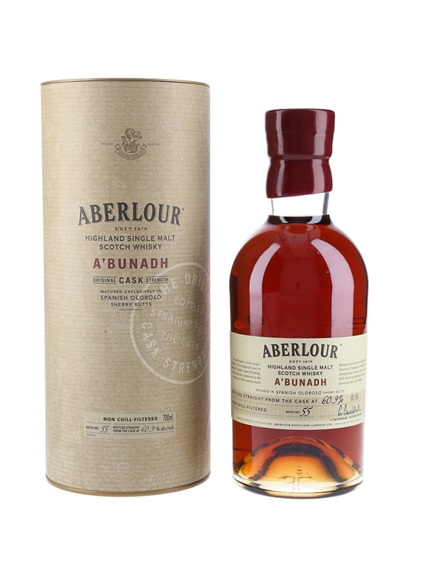 A bottle of Aberlour A'bunadh Batch 55, matured in a Spanish oloroso sherry butts and bottled at 60.9% ABV.