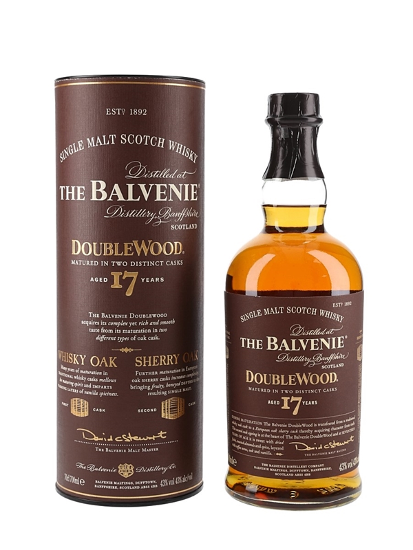 A bottle of The Balvenie 17 Year Old DoubleWood Single Malt Scotch Whisky. This was aged first in traditional whisky casks before transferring to sherry casks.