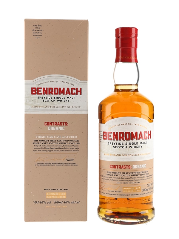 A bottle of Benromach 2013 Contrasts Organic Speyside Single Malt Scotch Whisky. This was distilled in 2022, aged for 8 years in Virgin American oak casks, and bottled at 46% ABV in 2022. This is the world first certified organic single malt and is fully accredited by the UK Soil Association.